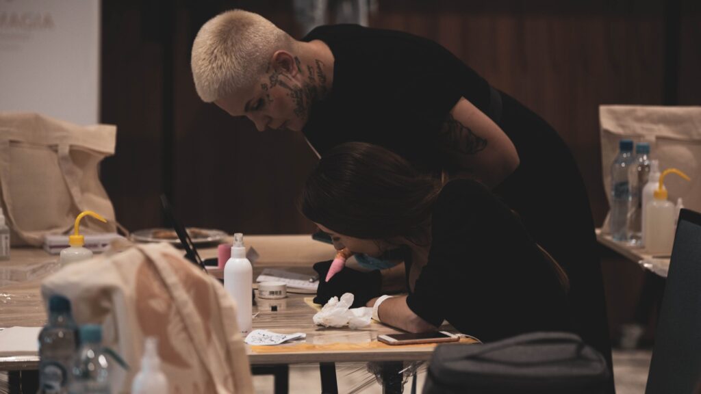 • pokaz tatuowania na żywo (przygotowanie wzoru, odbicie kalki, w trakcie tatuażu objaśnienie techniki, dobór igły, kąt nachylenia, wysuw igły itd..